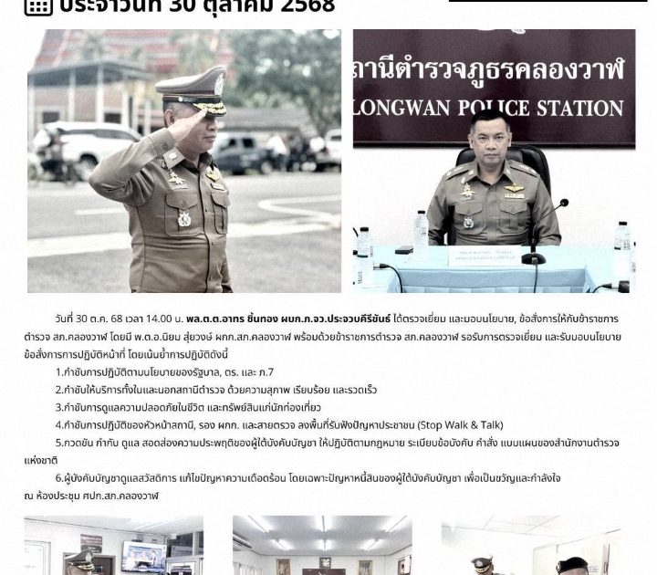 เดินทางมาตรวจเยี่ยม มอบนโยบาย และกำชับการปฏิบัติตามนโยบายของรัฐบาล, ผบ.ตร. และผบช.ภ.7 โดยเน้นย้ำการลงพื้นที่รับฟังปัญหาประชาชน (Stop Walk &Talk) เพื่อสร้างเครือข่ายประชาชนในพื้นที่ และเพื่อเพิ่มประสิทธิภาพในการป้องกันปราบปราม รวมถึงการดูแลสวัสดิการแก่ข้าราชการตำรวจ เพื่อเป็นขวัญและกำลังใจให้กับผู้ใต้บังคับบัญชา