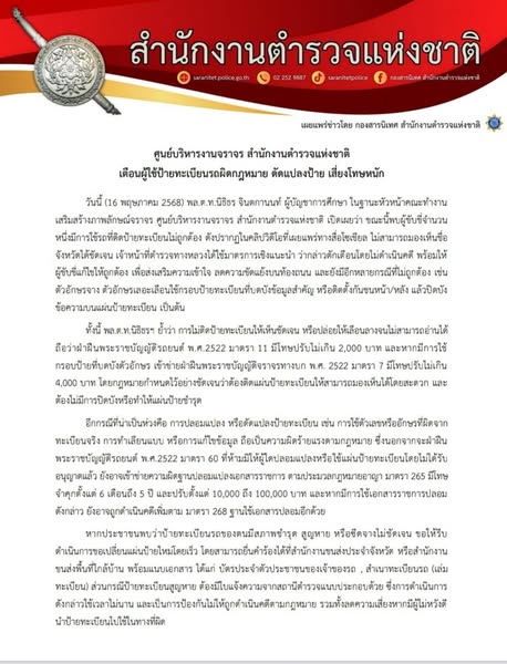 ศูนย์บริหารงานจราจร สำนักงานตำรวจแห่งชาติ เตือนผู้ใช้ป้ายทะเบียนรถผิดกฎหมาย ดัดแปลงป้าย เสี่ยงโทษหนัก