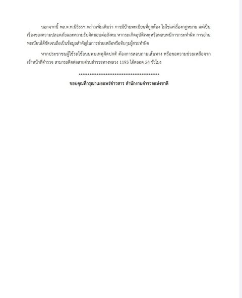 นอกจากนี้ พล.ต.ท.นิธิธรฯ กล่าวเพิ่มเติมว่า การมีป้ายทะเบียนที่ถูกต้อง ไม่ใช่แค่เรื่องกฎหมาย แต่เป็นเรื่องของความปลอดภัยและความรับผิดชอบต่อสังคม หากรถเกิดอุบัติเหตุหรือหลบหนีการกระทำผิด การอ่านทะเบียนได้ชัดเจนถือเป็นข้อมูลสำคัญในการช่วยเหลือหรือจับกุมผู้กระทำผิด