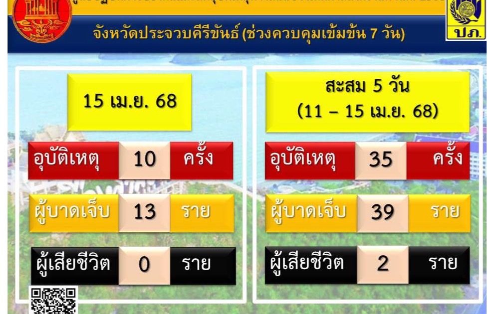 สถิติการเกิดอุบัติเหตุทางถนนช่วงเทศกาลสงกรานต์ พ.ศ.2568 ประจำวันที่ 15 เม.ย.68