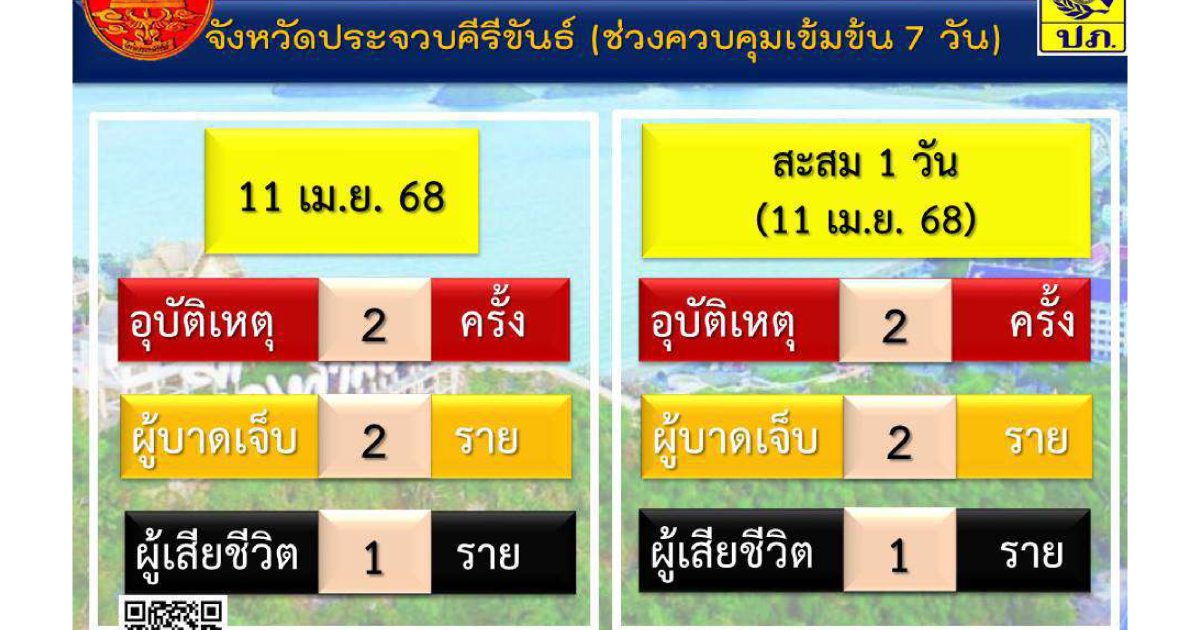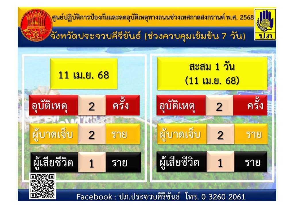 สถิติการเกิดอุบัติเหตุทางถนนช่วงเทศกาลสงกรานต์ พ.ศ.2568 ประจำวันที่ 11 เม.ย.68