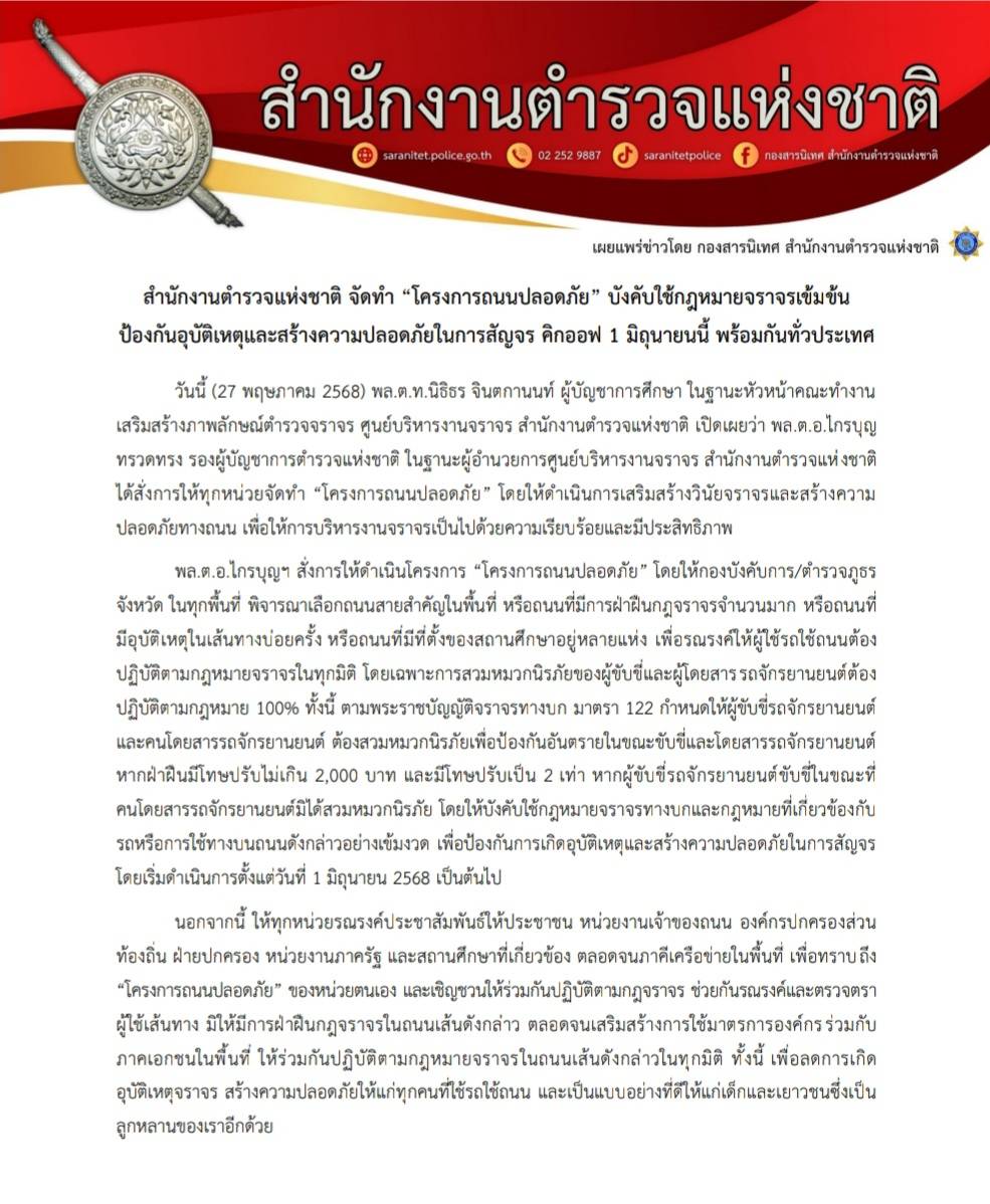 วันที่ 27 พฤษภาคม 2568 พล.ต.ท.นิธิธร จินตกานนท์ ผู้บัญชาการศึกษา ในฐานะหัวหน้าคณะทำงานเสริมสร้างภาพลักษณ์ตำรวจจราจร ศูนย์บริหารงานจราจร สำนักงานตำรวจแห่งชาติ เปิดเผยว่า พล.ต.อ.ไกรบุญ ทรวดทรง รองผู้บัญชาการตำรวจแห่งชาติ ในฐานะผู้อำนวยการศูนย์บริหารงานจราจร สำนักงานตำรวจแห่งชาติ ได้สั่งการให้ทุกหน่วยจัดทำ “โครงการถนนปลอดภัย” โดยให้ดำเนินการเสริมสร้างวินัยจราจรและสร้างความปลอดภัยทางถนน เพื่อให้การบริหารงานจราจรเป็นไปด้วยความเรียบร้อยและมีประสิทธิภาพ