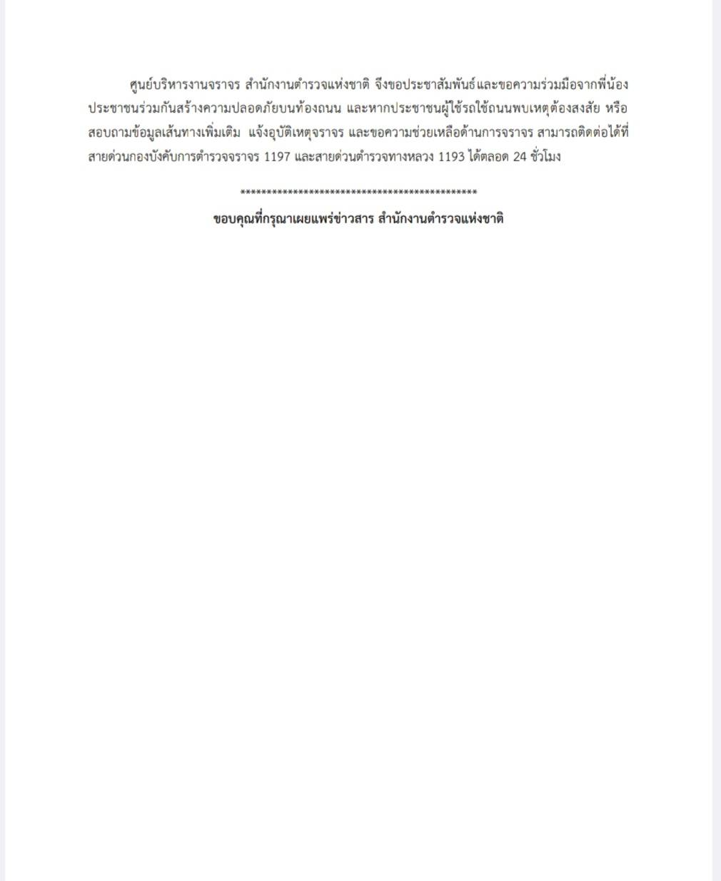 ศูนย์บริหารงานจราจร สำนักงานตำรวจแห่งชาติ จึงขอประชาสัมพันธ์และขอความร่วมมือจากพี่น้องประชาชนร่วมกันสร้างความปลอดภัยบนท้องถนน และหากประชาชนผู้ใช้รถใช้ถนนพบเหตุต้องสงสัย หรือสอบถามข้อมูลเส้นทางเพิ่มเติม แจ้งอุบัติเหตุจราจร และขอความช่วยเหลือด้านการจราจร สามารถติดต่อได้ที่สายด่วนกองบังคับการตำรวจจราจร 1197 และสายด่วนตำรวจทางหลวง 1193 ได้ตลอด 24 ชั่วโมง