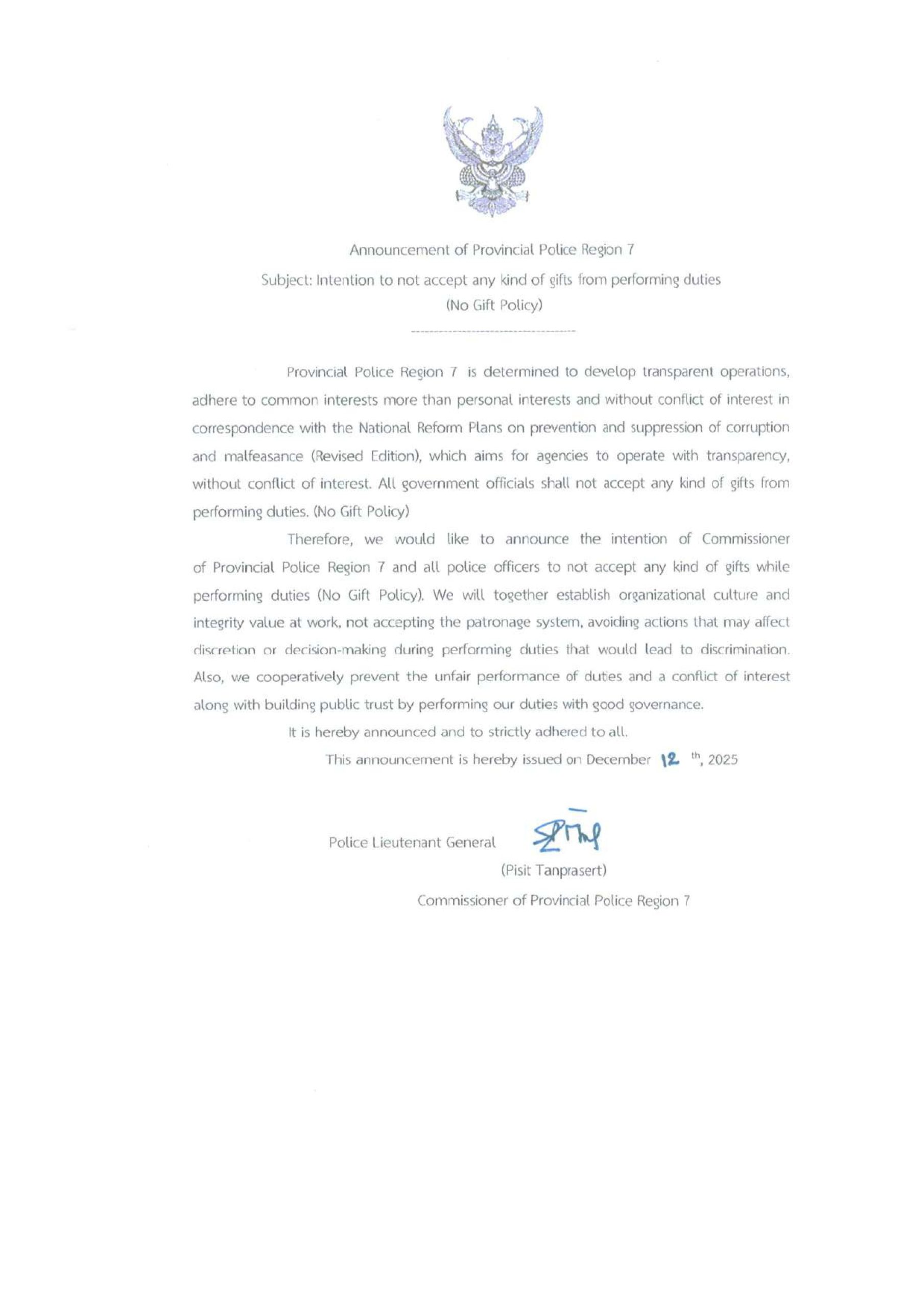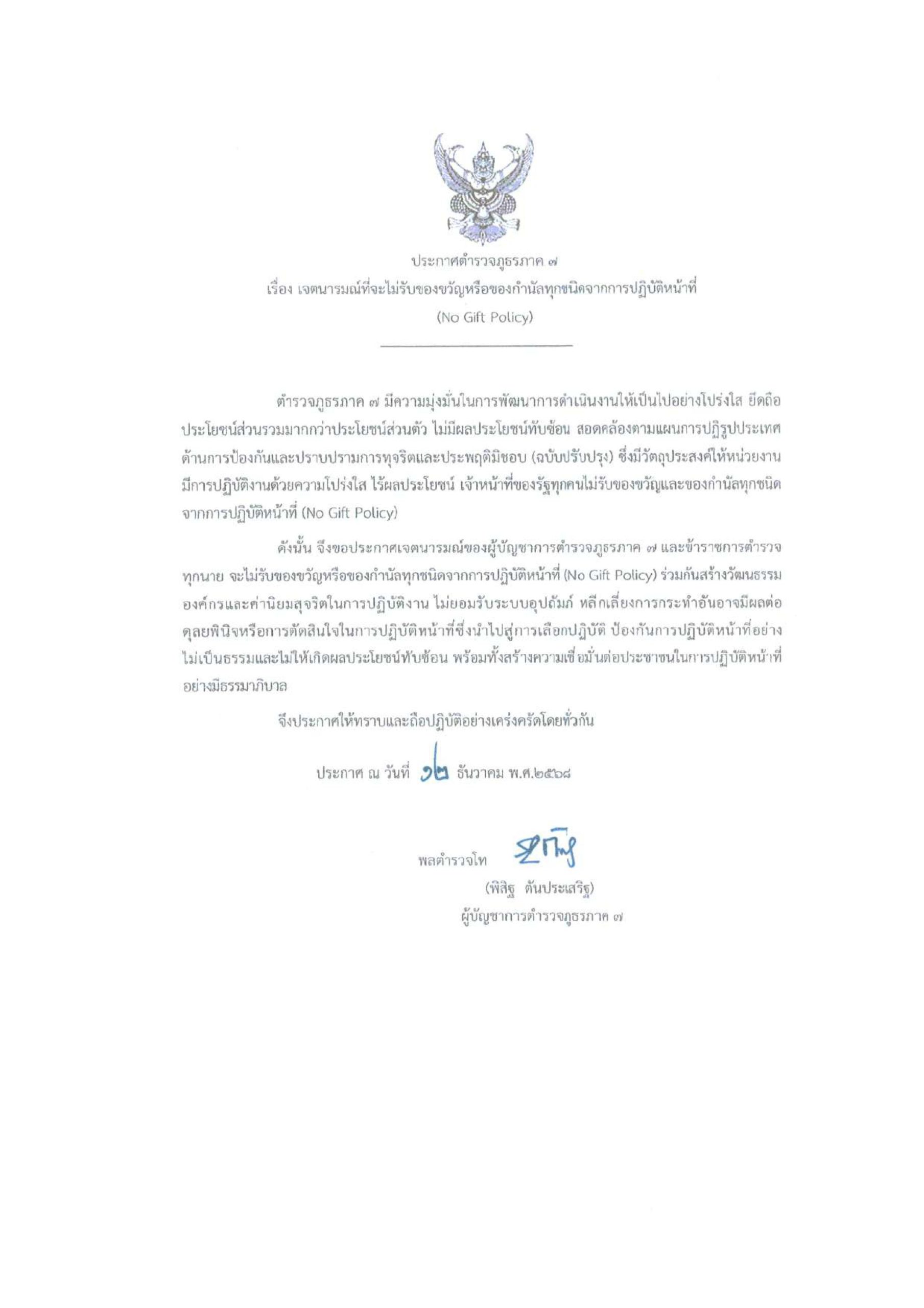 ประกาศตำรวจภูธรจังหวัดประจวบคีรีขันธ์ เรื่อง เจตนารมณ์ที่จะไม่รับของขวัญหรือของกำนัลทุกชนิดจากการปฏิบัติหน้าที่ (No Gift No Policy)