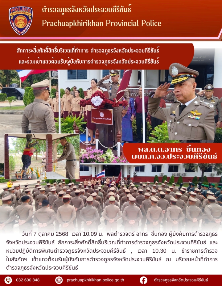วันที่ 7 ตุลาคม 2568 เวลา 10.09 น. พลตำรวจตรี อาทร ชิ้นทอง ผู้บังคับการตำรวจภูธรจังหวัดประจวบคีรีขัน