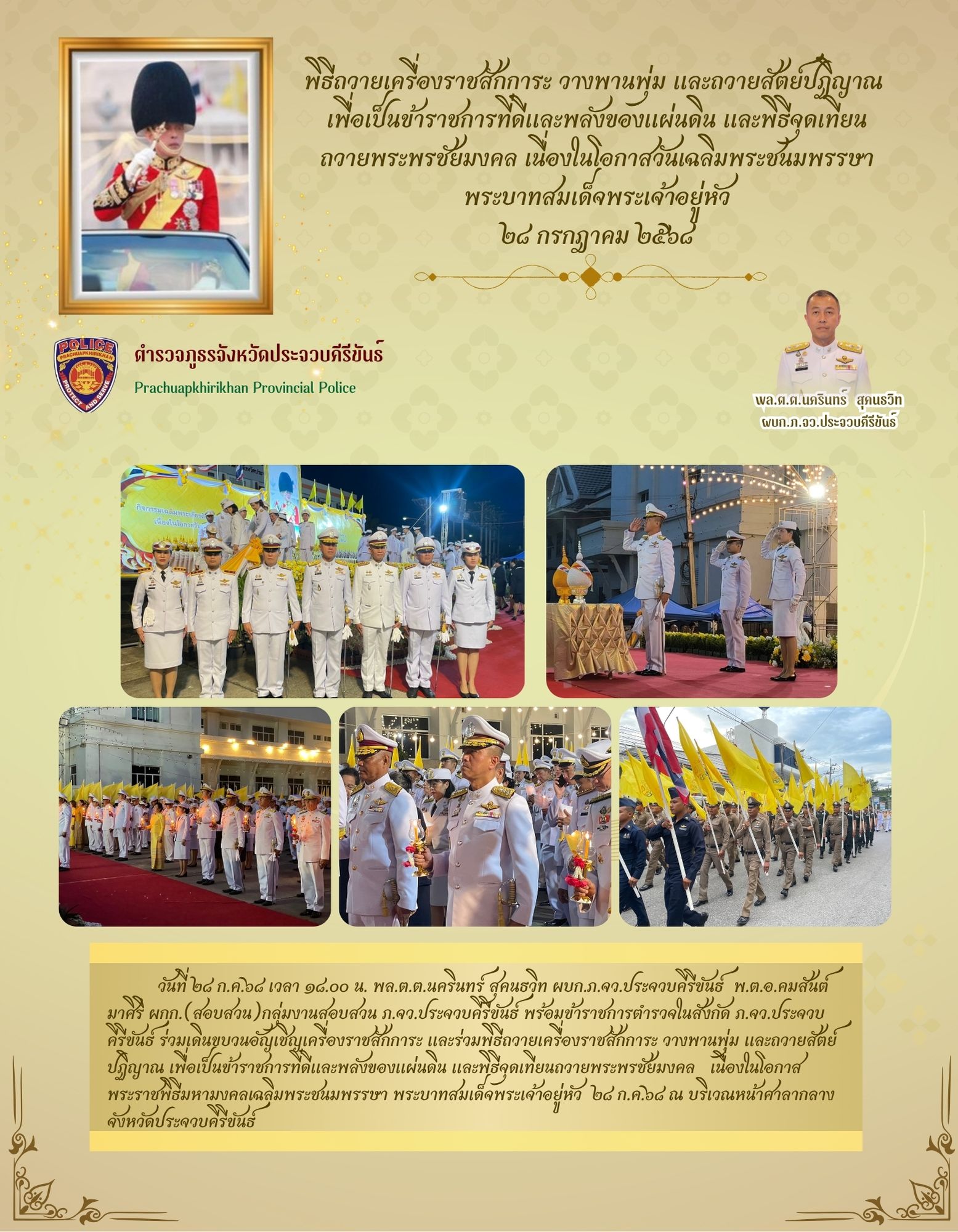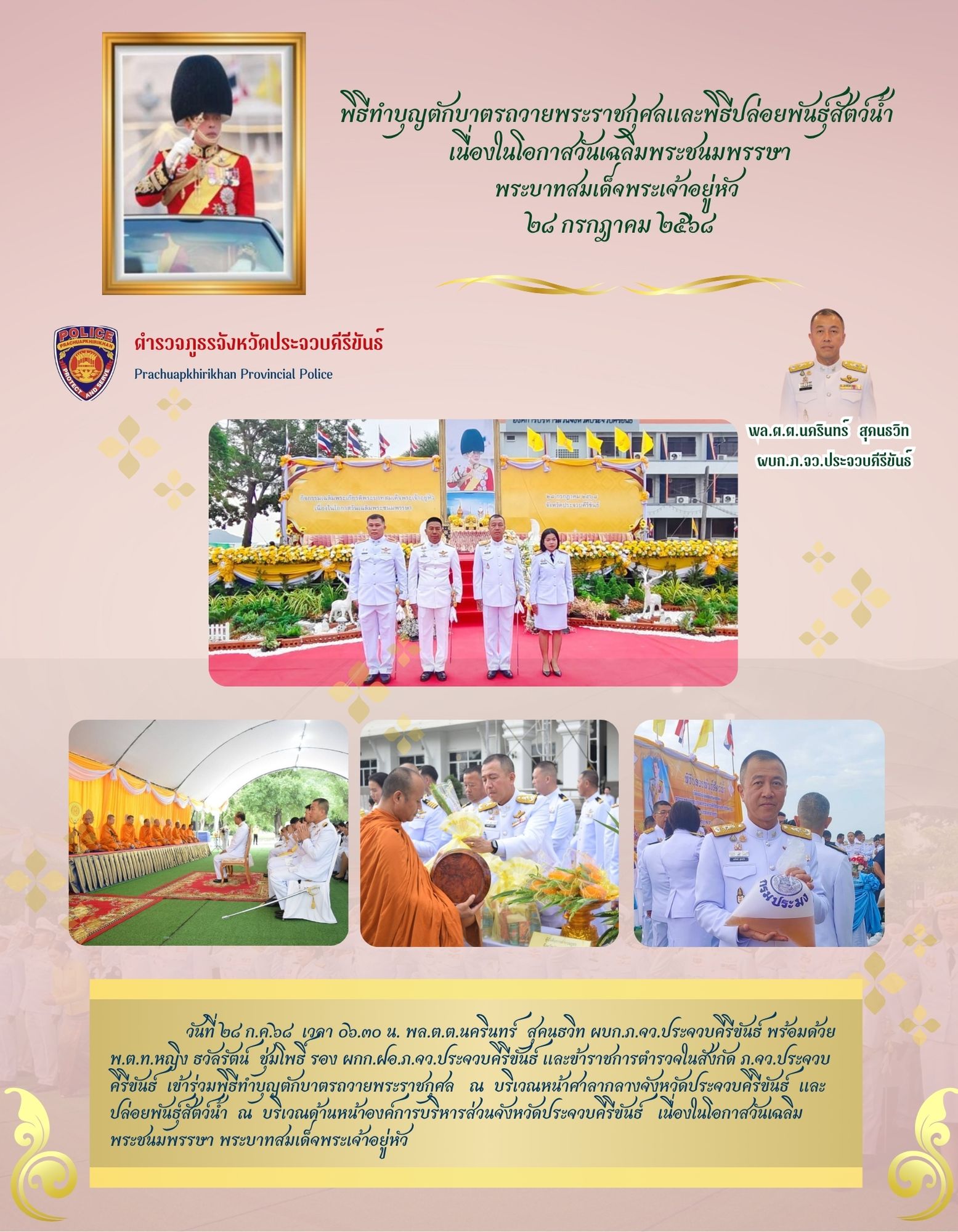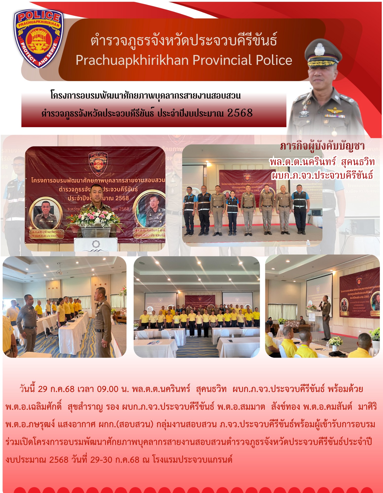 วันที่ 29 ก.ค.68 เวลา 14.00 น. – พล.ต.ต.นครินทร์ สุคนธวิทผบก.ภ.จว.ประจวบคีรีขันธ์ เข้าร่วมการป