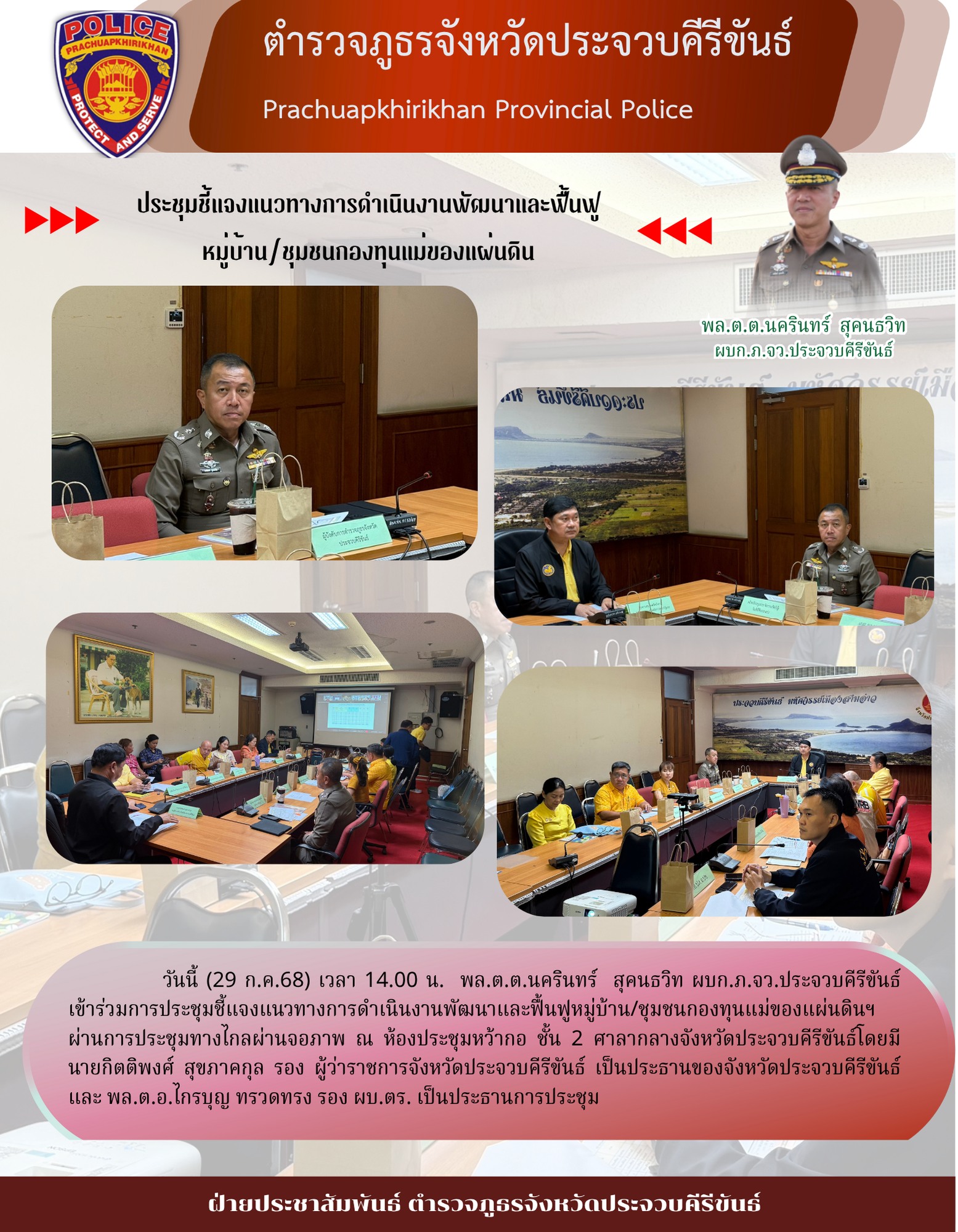 ร่วมการประชุมชี้แจงแนวทางการดำเนินงานพัฒนาและฟื้นฟูหมู่บ้าน/ชุมชน กองทุนแม่ของแผ่นดินฯ ผ่านการประชุมทางไกลผ่านจอภาพ ณ ห้องประชุมหว้ากอ ชั้น 2 ศาลากลางจังหวัดประจวบคีรีขันธ์